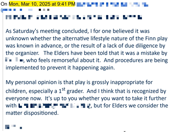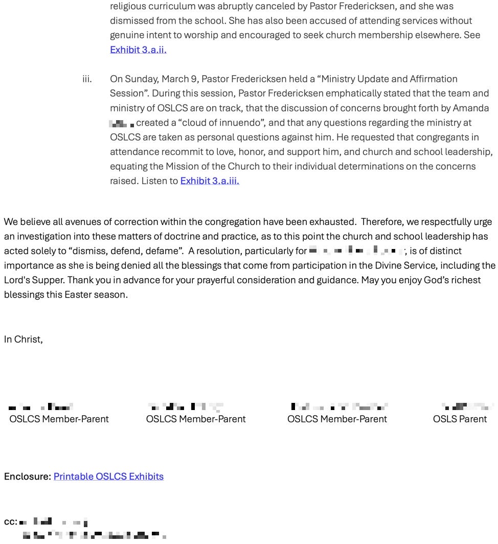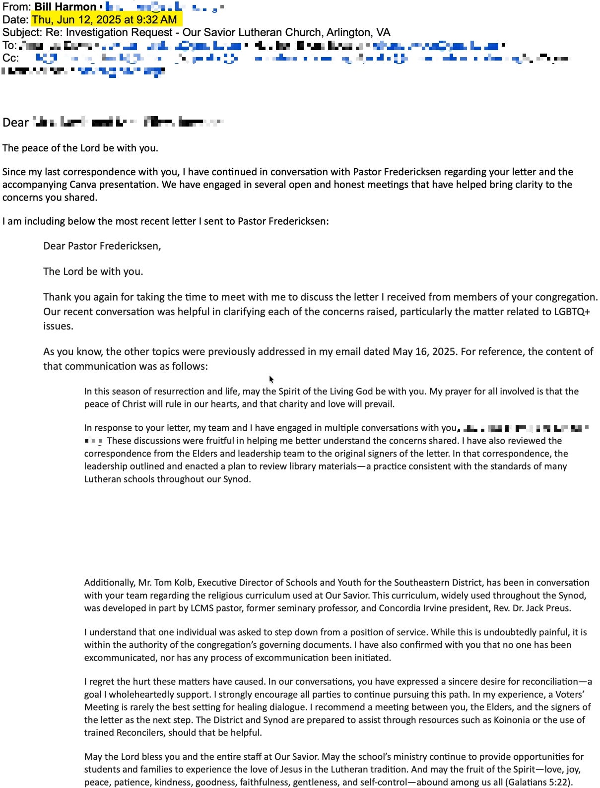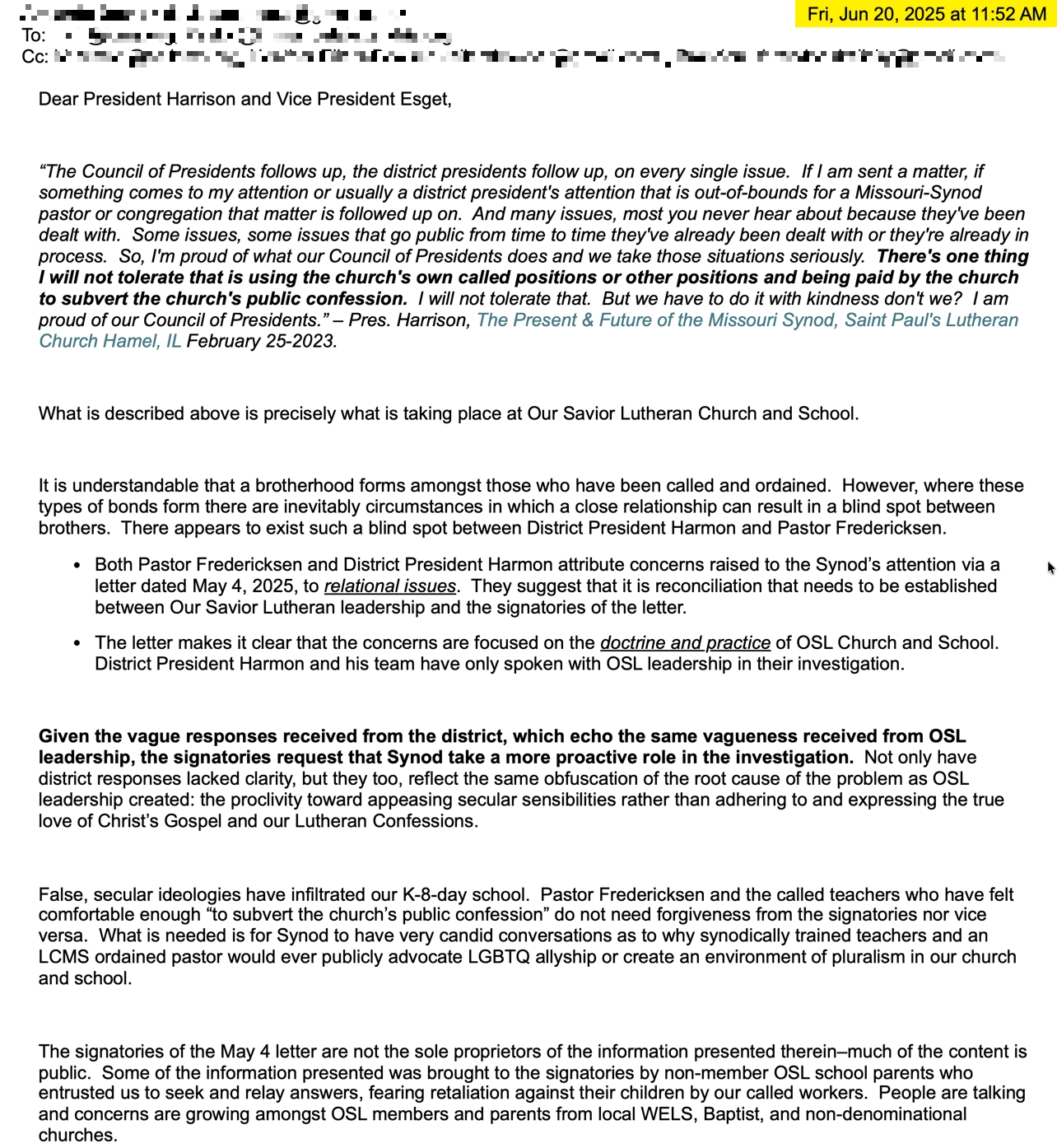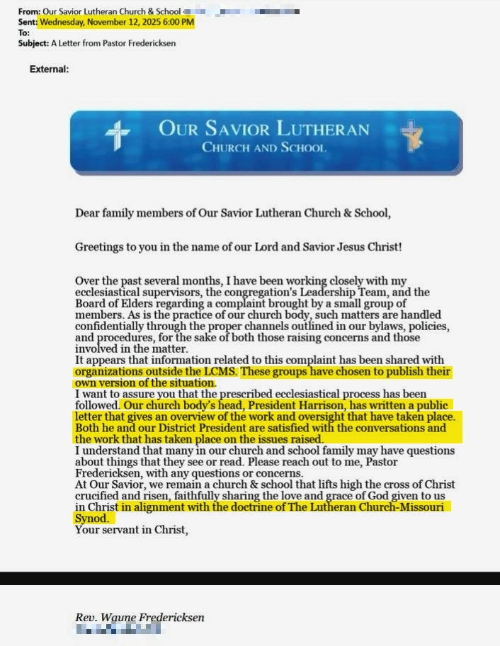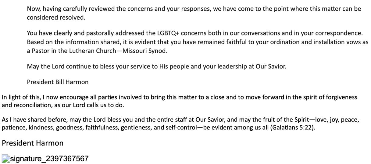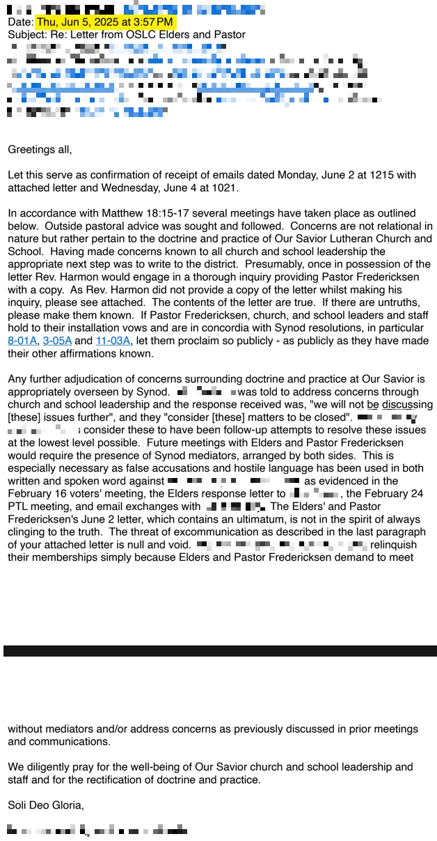 By June 12, 2025, President Harmon declared the matter “closed”. However, the images of Pr. Fredericksen's modeling of the transgender stole for a transgender parishioner remained online until Ad Crucem News alerted Synodical leadership to the impending story. Only then was an attempt made to scrub images and the website of the transgender artist and parishioner of the church, who created the stole that Pr. Fredericksen posed with - was taken down. There are still cached images of the modeling project online.