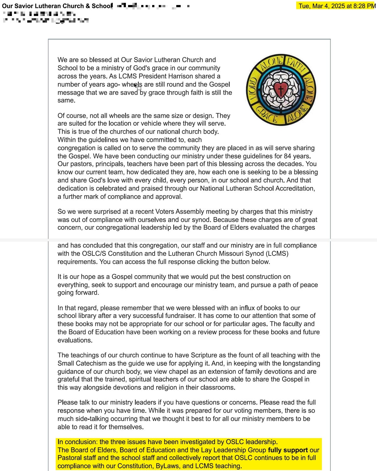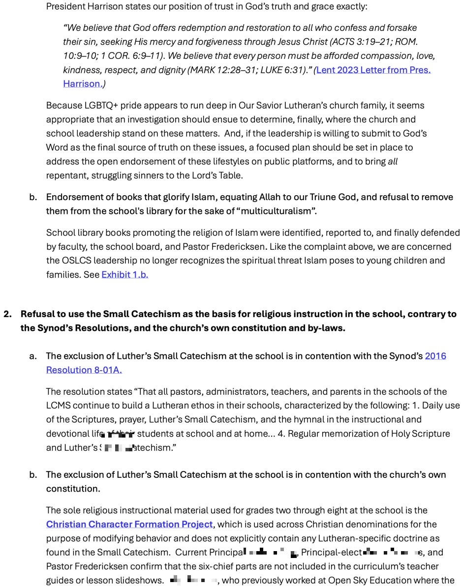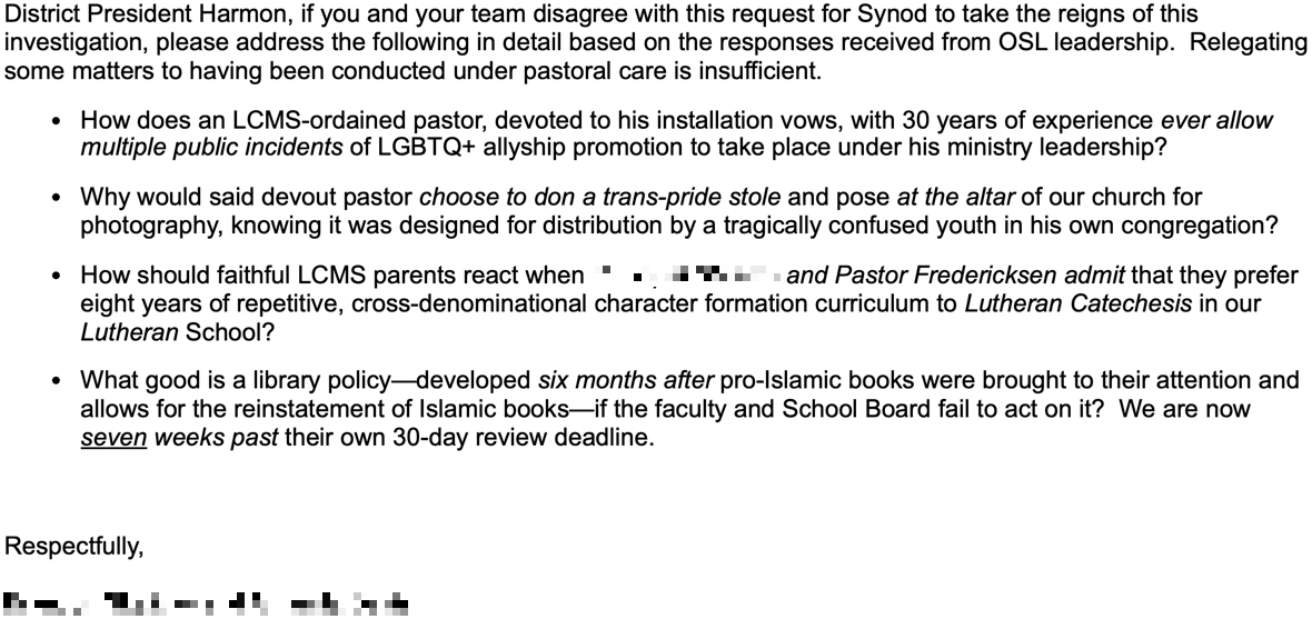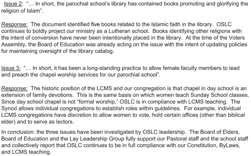 OSLCS’s pastor and congregation exhibit a pattern of public renunciation of the Christian faith akin to that of the ELCA and other mainline churches. It defies explanation that consequential ecclesiastical discipline has yet to be achieved, or that this congregation was ever allowed to enter this heretical state.