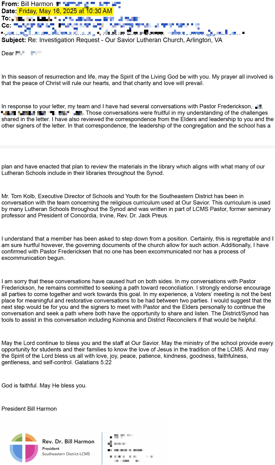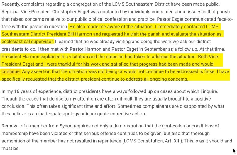 In President Harrison’s letter about LCMS ecclesiastical supervision, statements were made that are contradicted by the correspondence chain above: