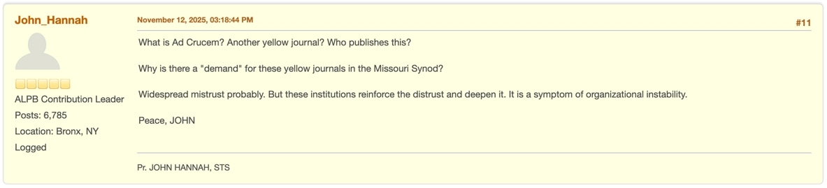 Pray for Ad Crucem (the Woods), as I know this is not easy for them to do and is certainly resulting in a lot of scorn directed at them. Pray for those of this church body who were harmed in the unwillingness to address this at the outset.