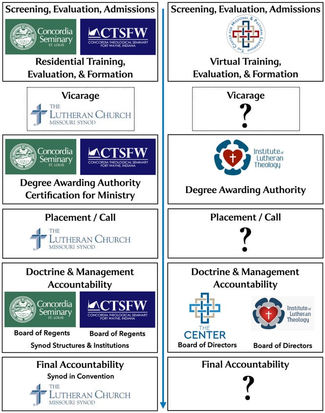 That’s an eyebrow-raising notion, but the issue is deeper than mere academic competence. Before we discuss academic catalogs and faculty qualifications, let’s consider governance structures and lines of accountability. As imperfect as the LCMS is, it has unambiguous mechanisms and procedures to address problems and advance what is best. It has scaffolded governance that overlaps in a dozen places.