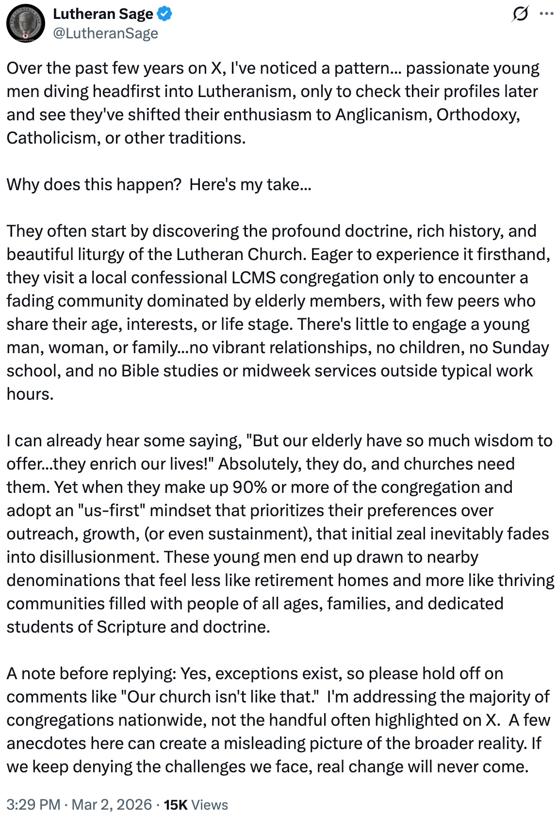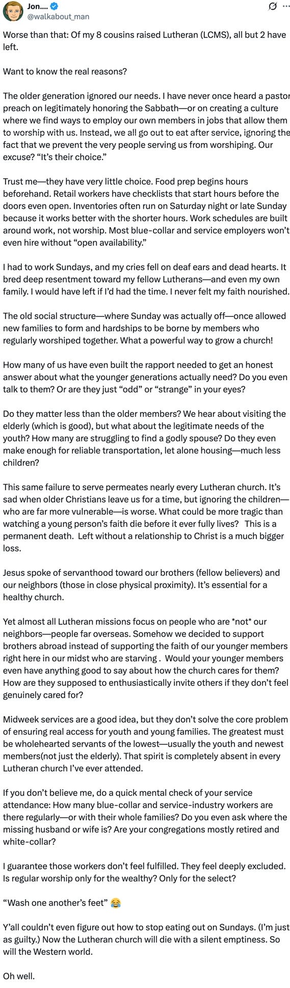 As an amateur anthropologist interested in the religious bodies of America, I have learned a lot by monitoring social media. Two recent X posts caught my attention, and I urge the teachers of the church throughout the Lutheran Church—Missouri Synod (LCMS) to prioritize reading and thoroughly digesting the thread reproduced below (the link includes many interesting comments not included here).