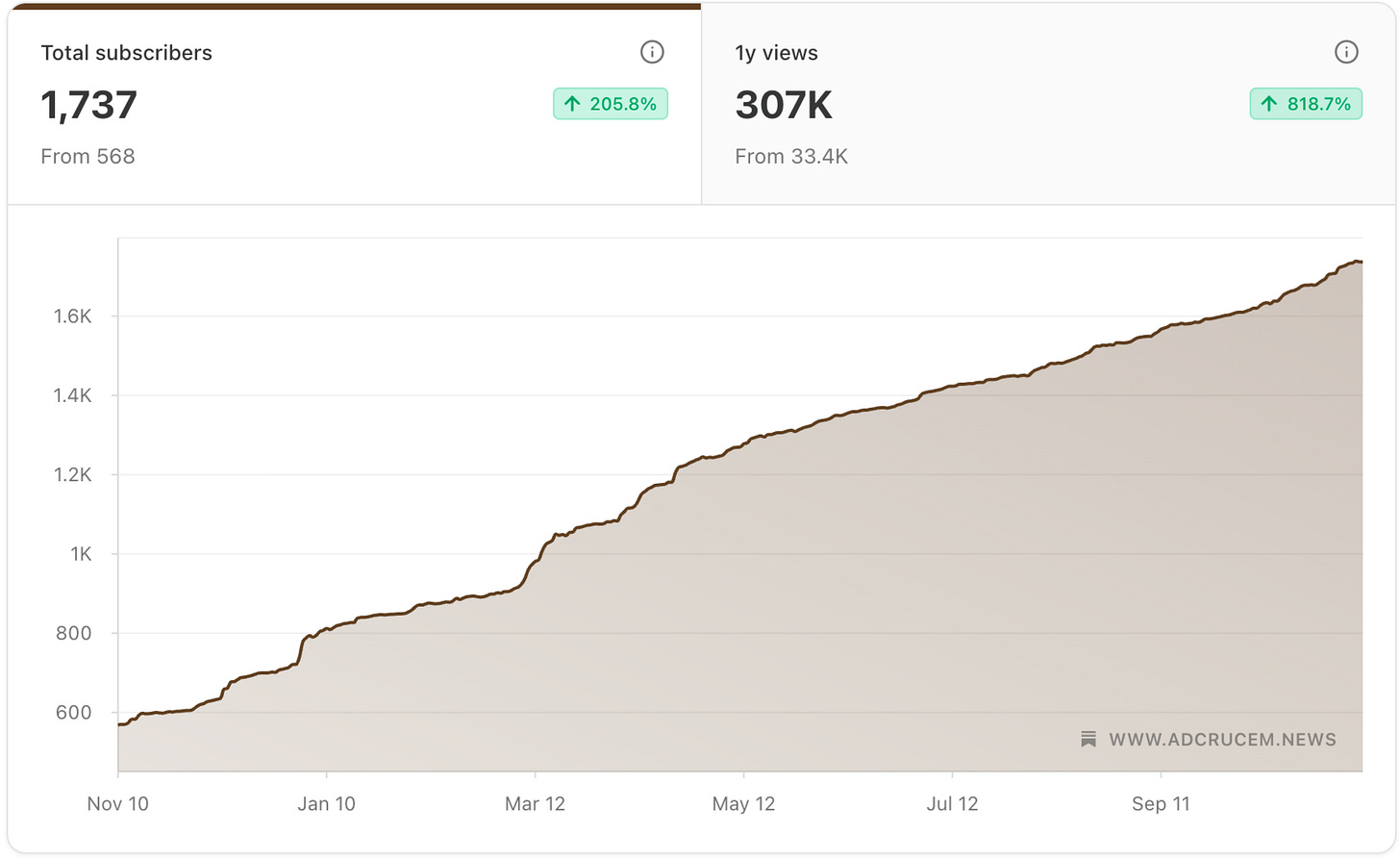Ad Crucem News, without any paid promotion and through word of mouth alone, has achieved an 819% increase in views over the last 12 months, with +300,000 views and +50,000 unique readers (across all sources, but with just ~1,700 free subscribers and ~2,100 followers). Accounting for reprints and untracked forwards, views are closer to an annualized 400,000. At the current run rate of ~40,000 views per month, 500,000 annual views is in reach next year.