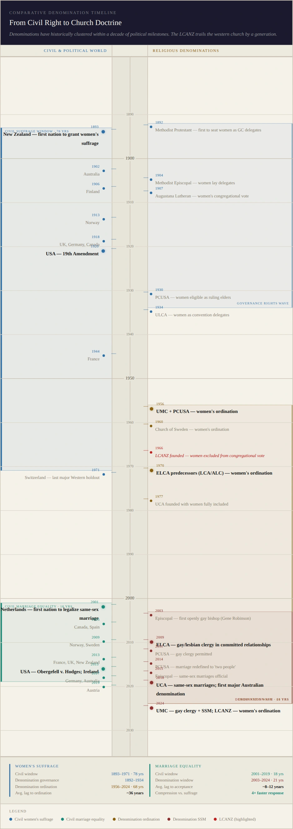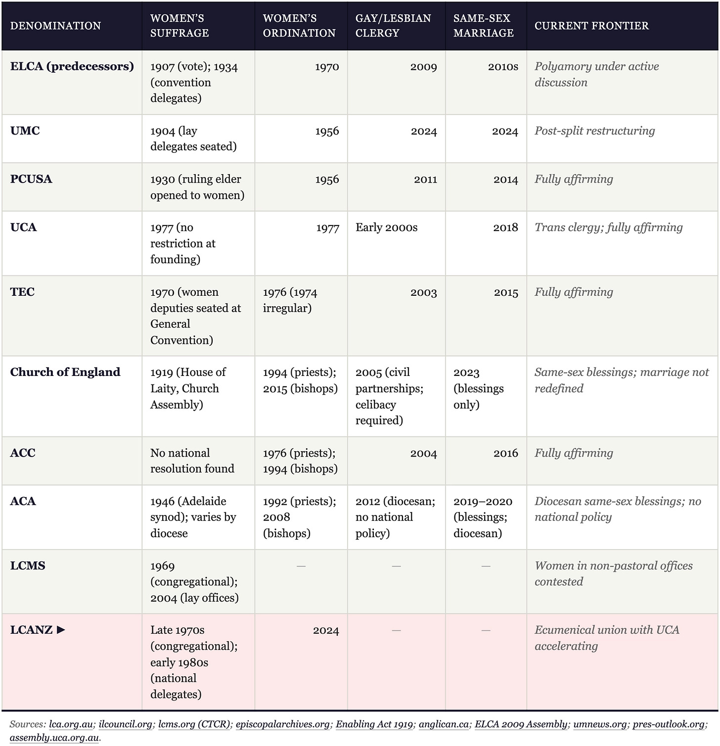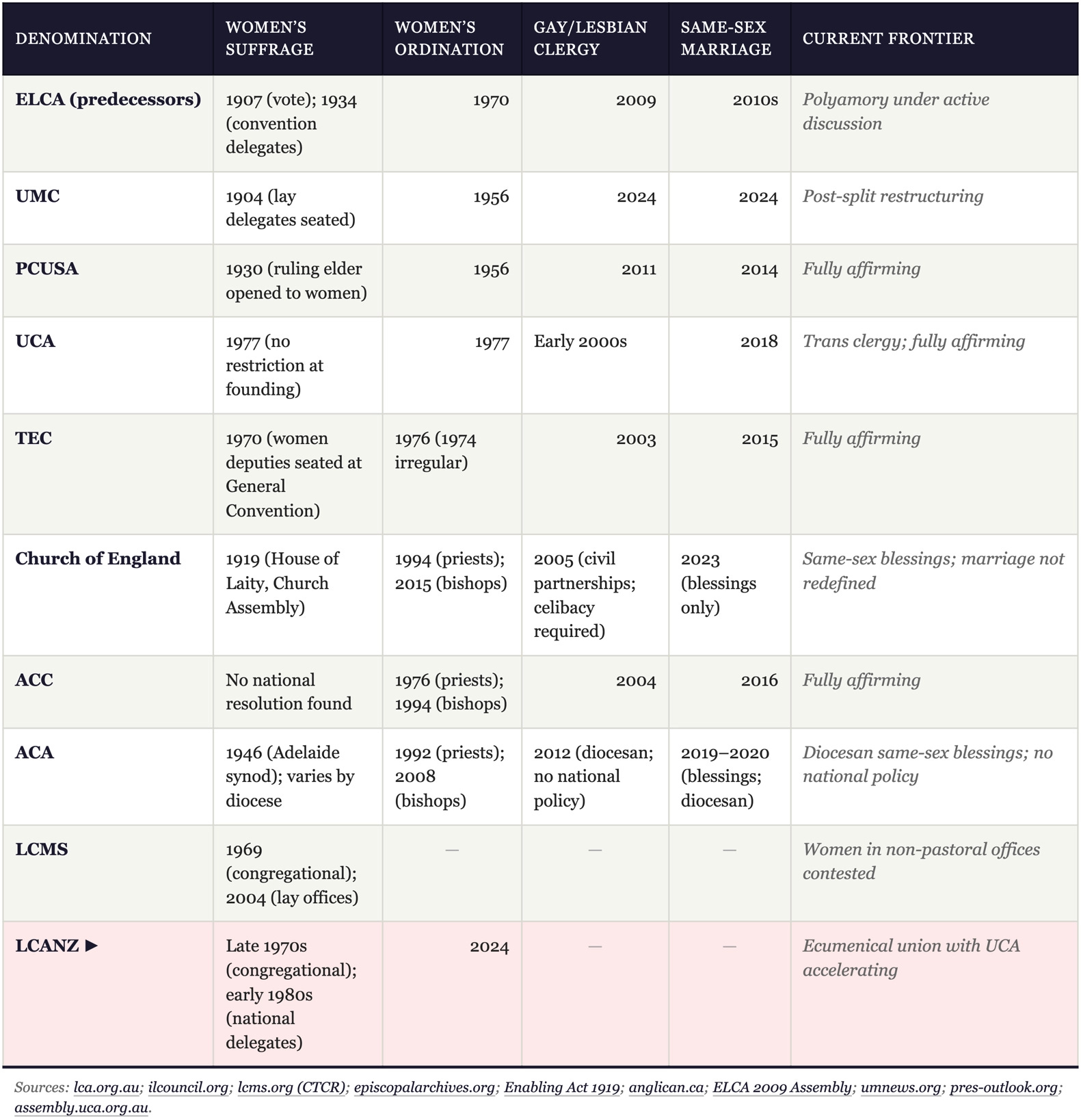 The LCANZ formally excluded women from congregational voting at its 1966 establishment, a full generation after comparable denominations had resolved the question. It moved through female suffrage, female lay leadership, and female ordination in roughly 58 years. For comparison, the UMC took 120 years from seating women delegates (1904) to adopting same-sex marriage (2024).