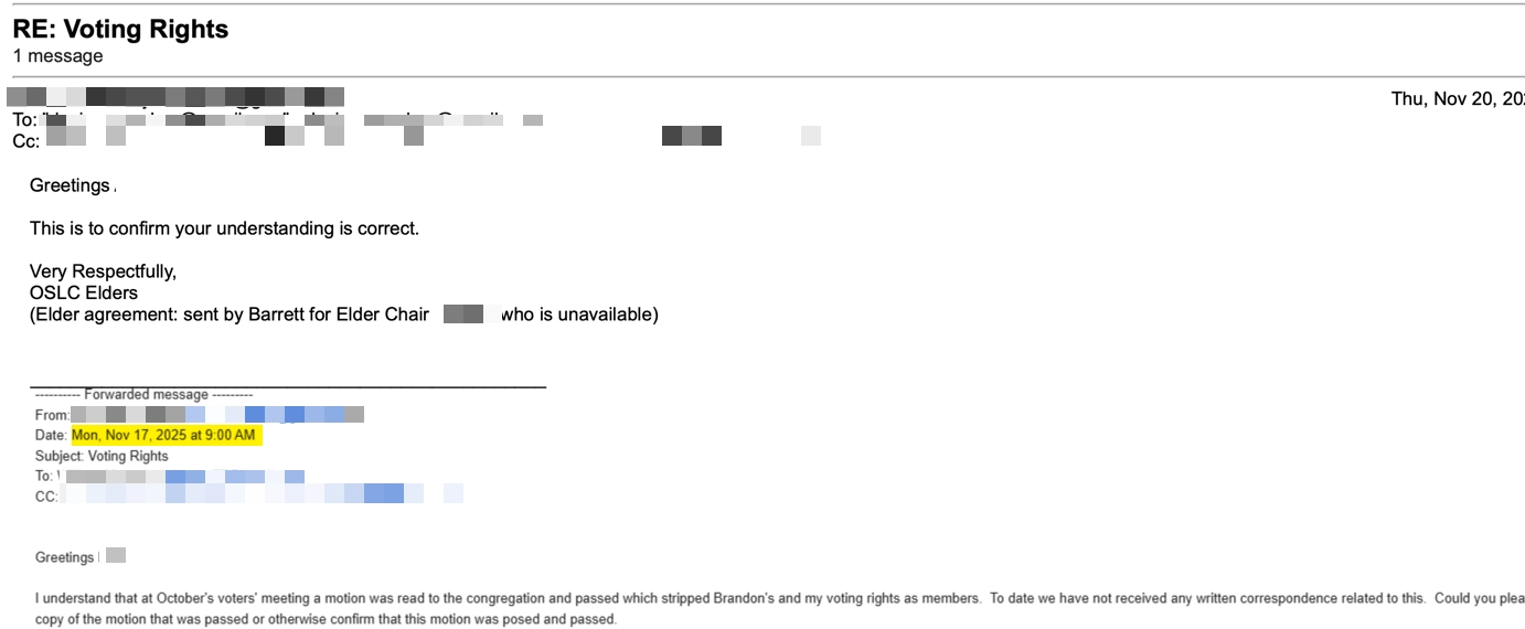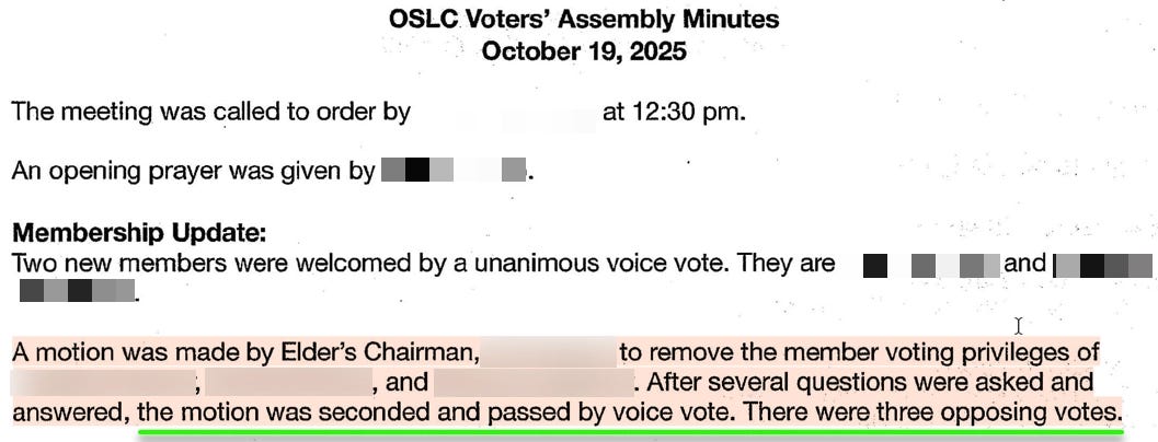 On October 19, 2025, an OSLCS Voters’ Assembly rode roughshod over the congregation’s own Constitution and Bylaws by passing a motion to “remove the voting privileges” of three named voting members. The motion cited no grounds, was taken by a voice vote, denied the affected parties any opportunity to defend themselves, and appears to have relied on a single ambiguous bylaw clause that cannot authorize the creation of new membership classes.