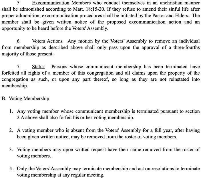A voice vote cannot establish a supermajority2. Consequently, nothing in the minutes indicates that the complainants’ communicant membership was terminated. Instead, the assembly fabricated a new disciplinary half-step: ‘remove voting rights but keep communicant membership,’ which the Constitution simply does not allow.