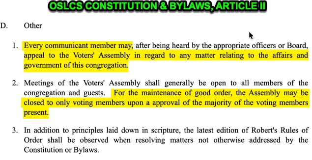 OSLCS’s October 19 meeting was not an unfortunate lapse or a minor procedural wrinkle; it is the predictable outcome of a congregation that has abandoned the most elementary norms of Christian accountability and congregational governance. A church that cannot keep its own Constitution cannot credibly claim to keep the Confessions it swears to uphold. A church that strips voting rights from its own members by ambush and voice vote has lost both a parliamentary contest and its integrity.