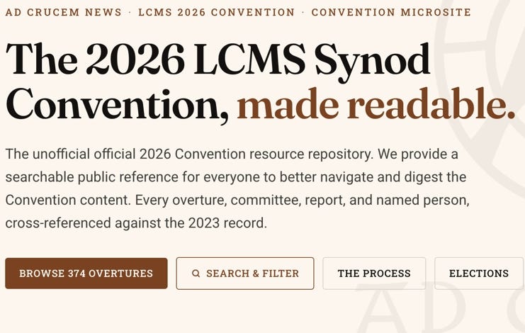 The LCMS 2026 Convention Microsite, published by Ad Crucem News at lcms2026.adcrucem.news, is a structured, searchable, cross-referenced public reference for every substantive element of the 2026 convention. It is free to use, requires no account, and carries no paywall.