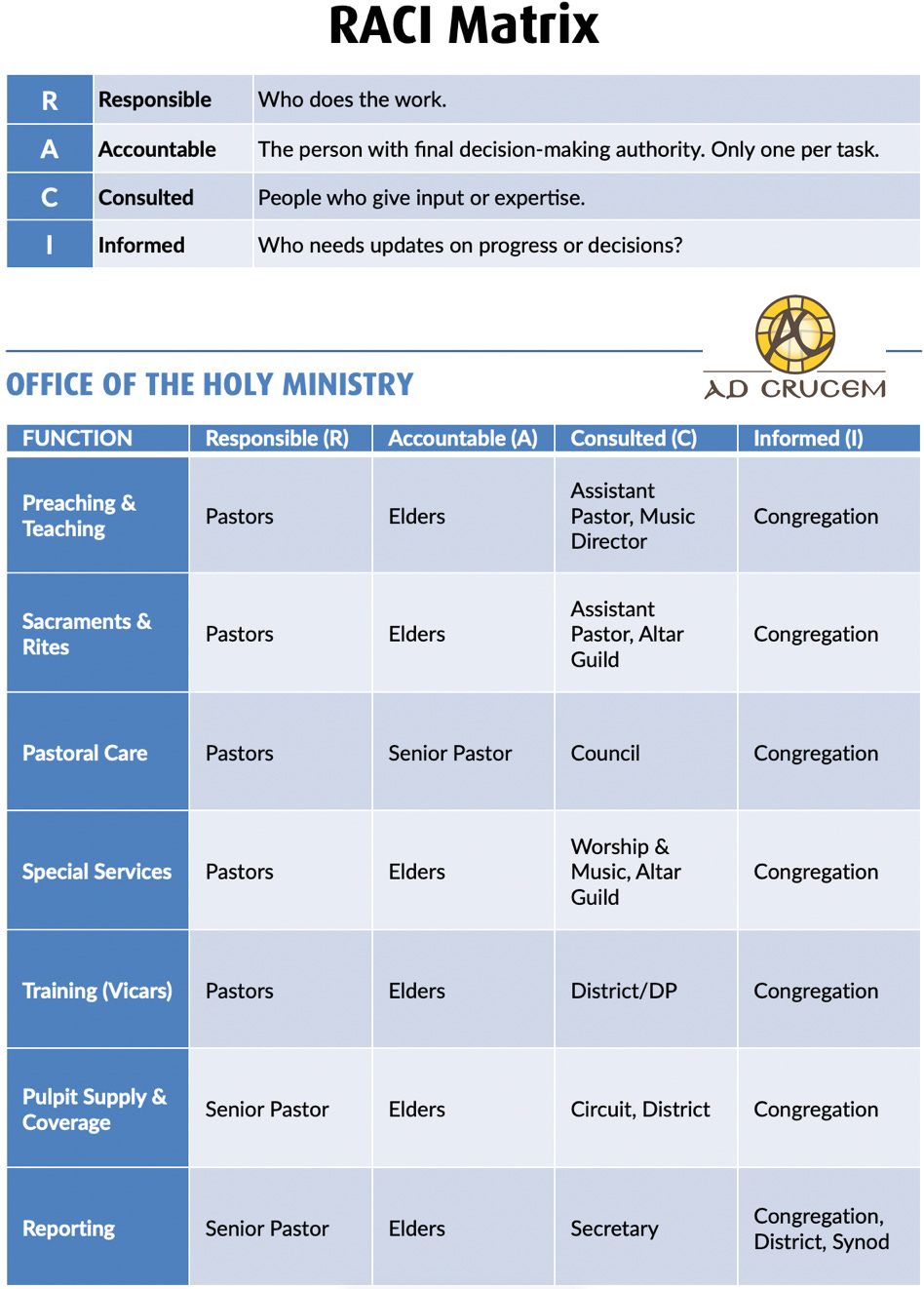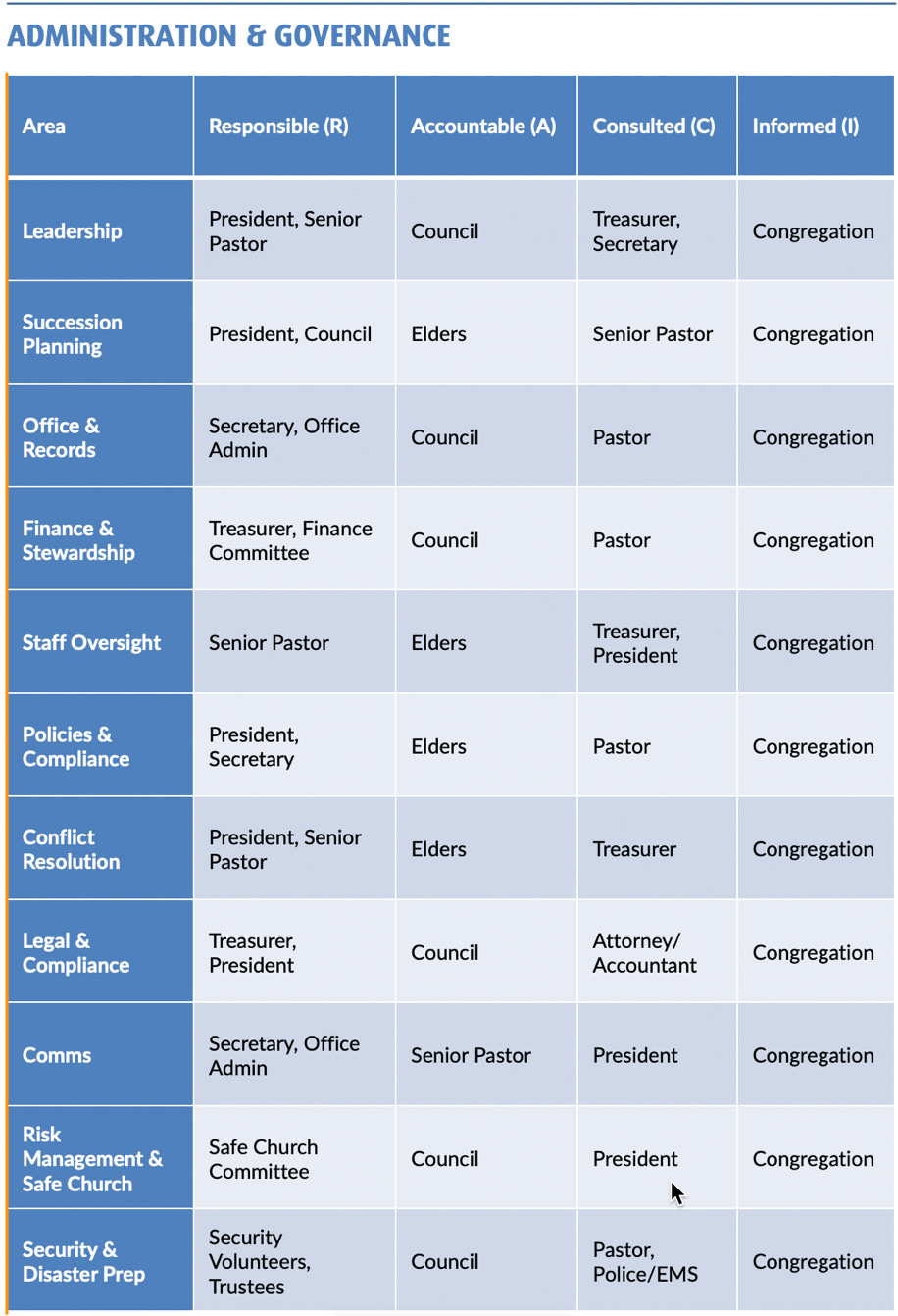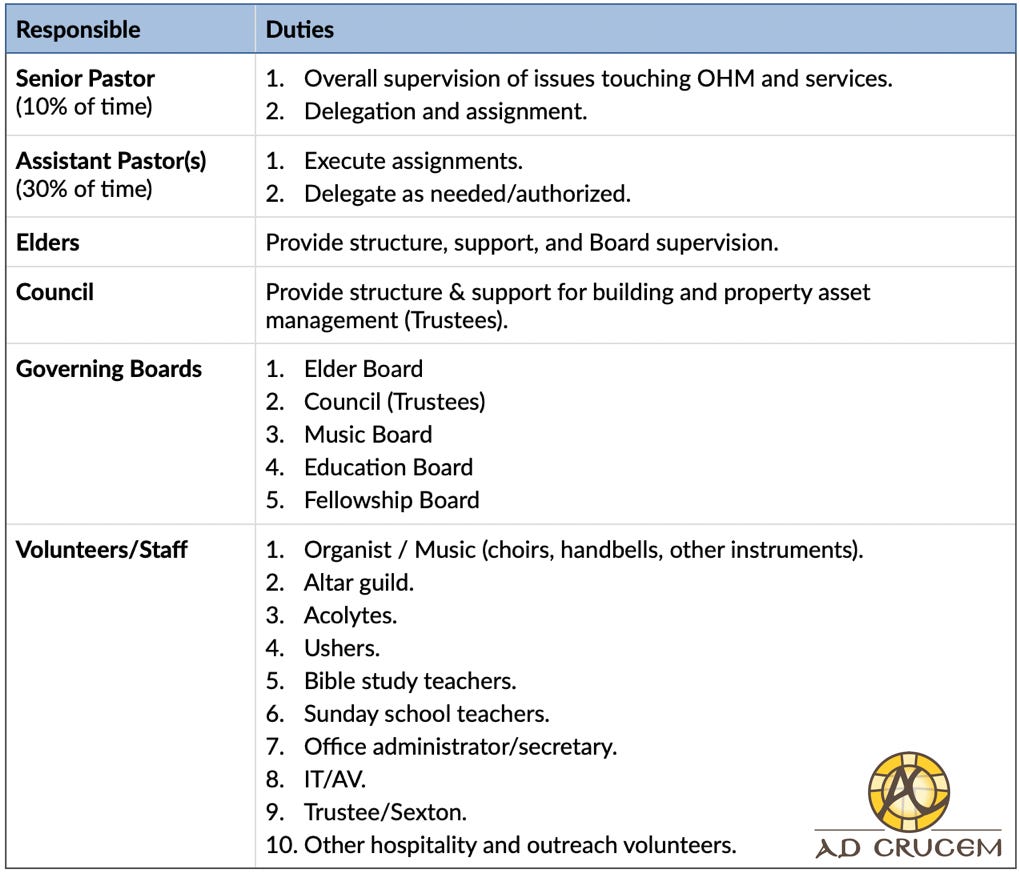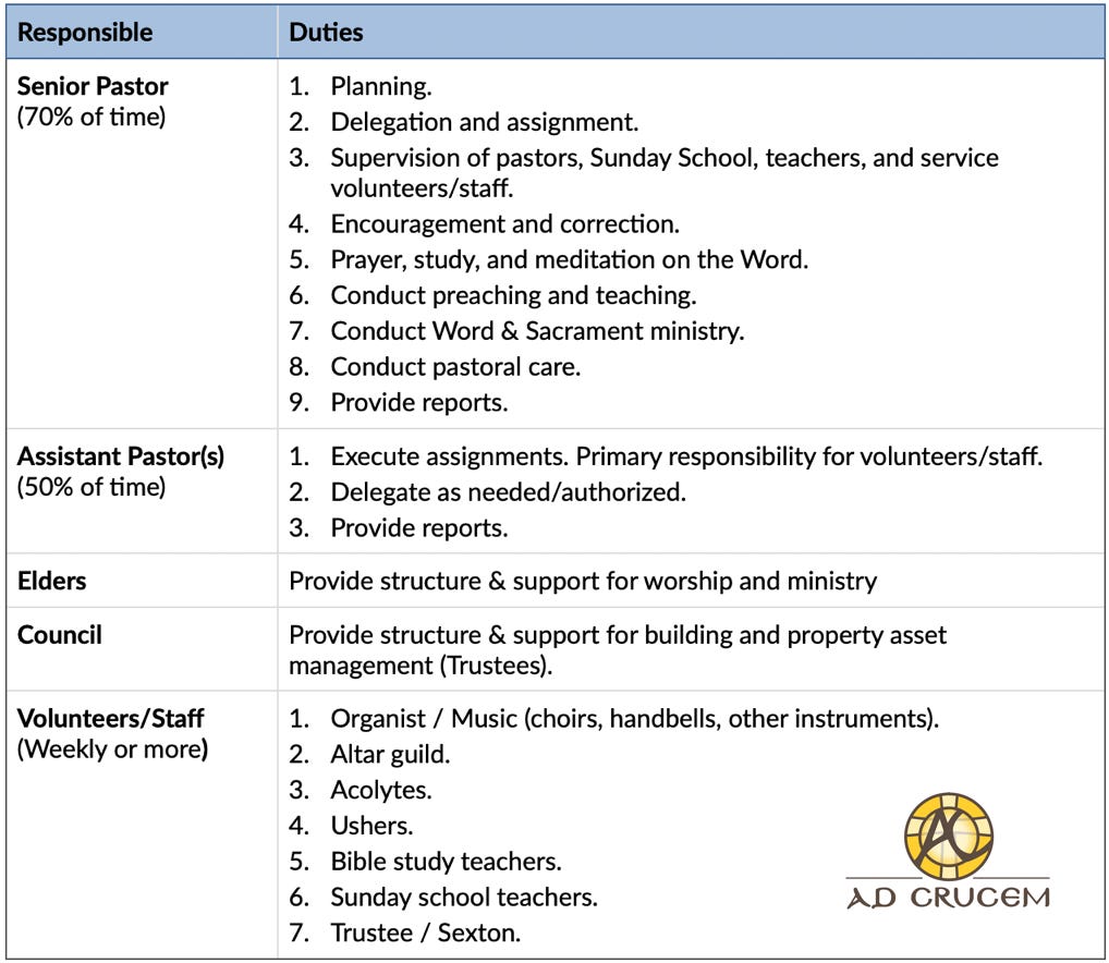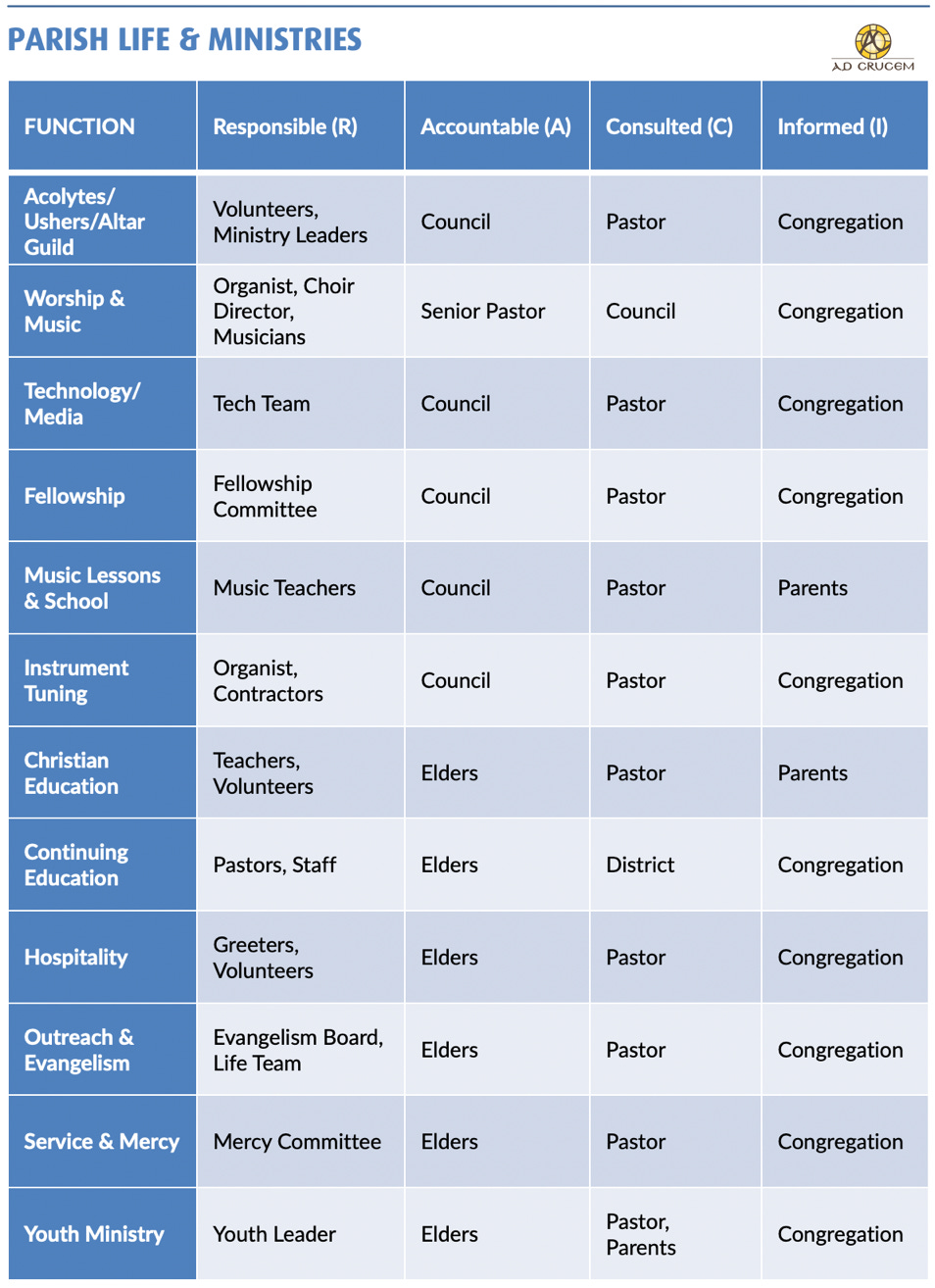 Before you can address the shortcomings, your congregation needs to know what it has and what it doesn’t have, and then where to prioritize, invest, or cut back. Below are some ways to frame and think about your church’s structure and functions. Every church is unique, so the information provided is illustrative rather than exhaustive, and it is certainly not prescriptive; however, it will cover approximately 80% of the Synod’s parishes.
