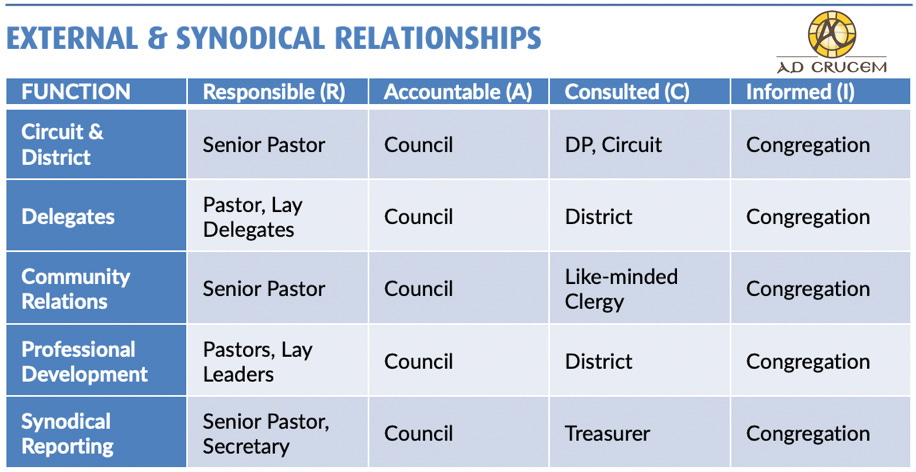 Pastor conferences, circuit meetings, forums, reports, and DP engagement for defined issues such as calls and church discipline matters.Delegate roles: