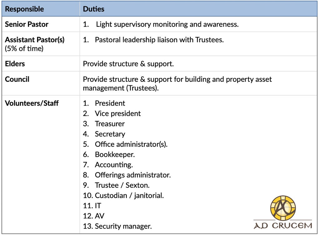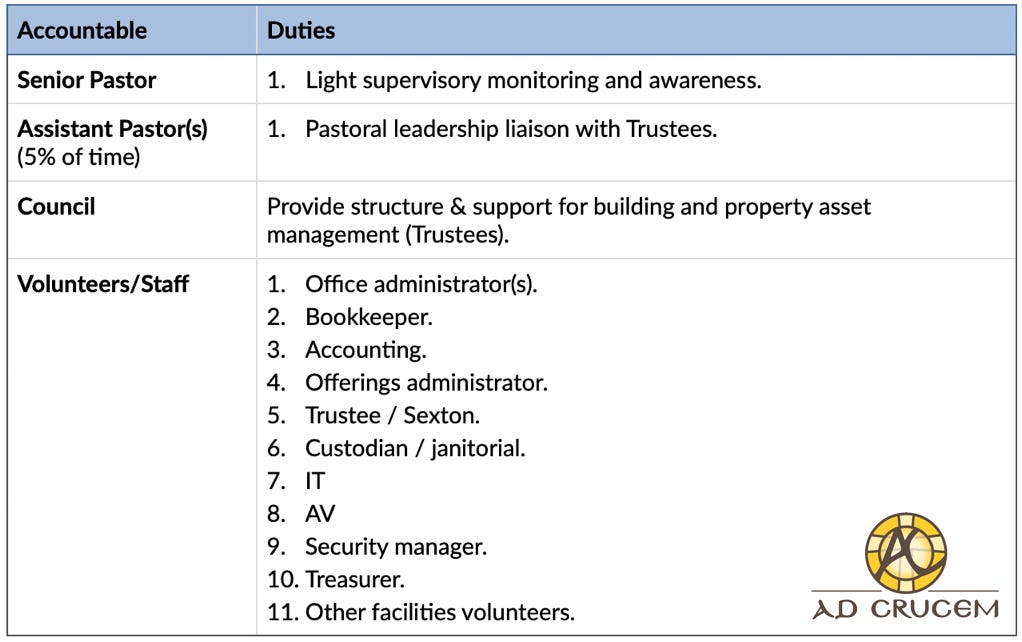 Budgeting, accounting, bookkeeping, banking, human resources, offering counting, and stewardship oversight.Staff Oversight: