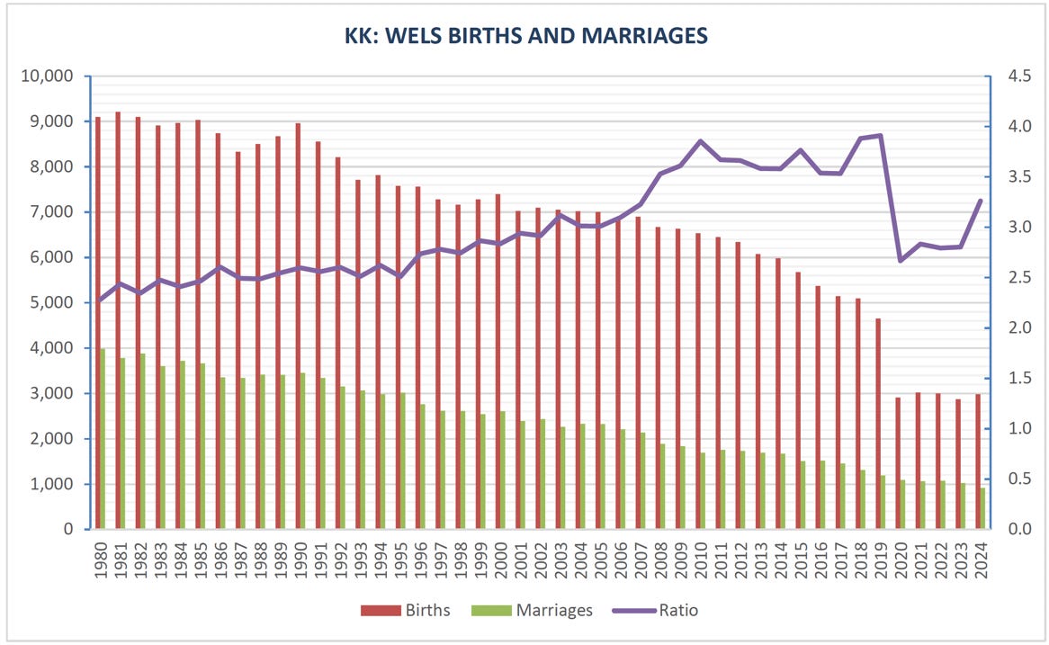 It is noteworthy that WELS has experienced four years of rising attendance and record adult confirmations (4,100 in 2024), so it’s not all doom and gloom. Nevertheless, overall, family formation in the WELS is in dire condition, with marriages falling below 1,000 in 2024 for the first time, as the Synod’s youngsters move toward extinction and mildly delay marriage.
