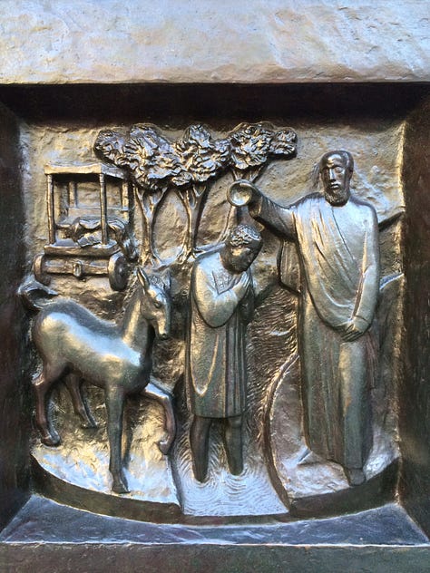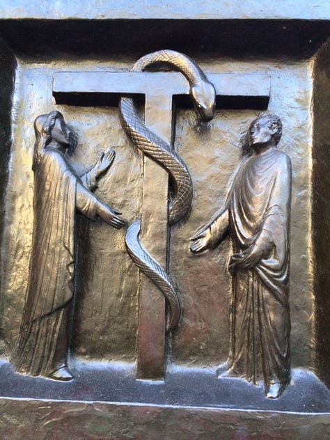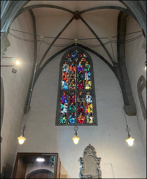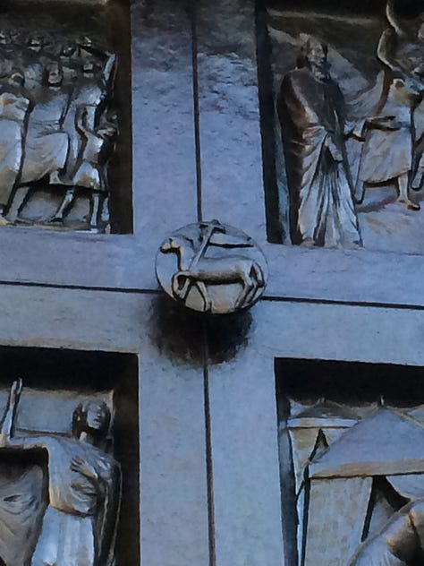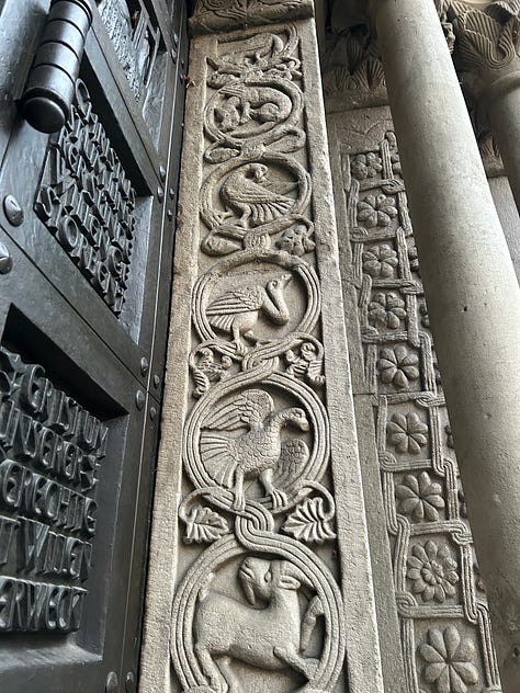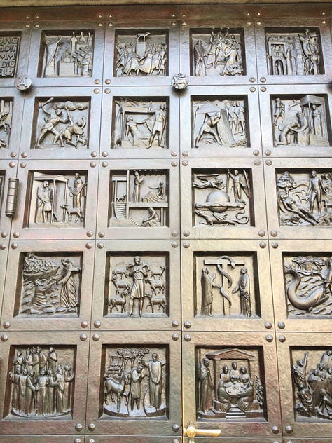 Another church I enjoy visiting in Zurich is the Grossmunster Cathedral. It has used thinly sliced agate for light around the doors, the light shines through the stone, bringing an ephemeral hue to the inside of the church. The doors of this church are fascinating, I wish I had traveled with a step ladder, so that I could get a better look at the images higher up, but alas, ladders don’t fit in my luggage. This church was built around the 12th century AD, and is also Calvinist.