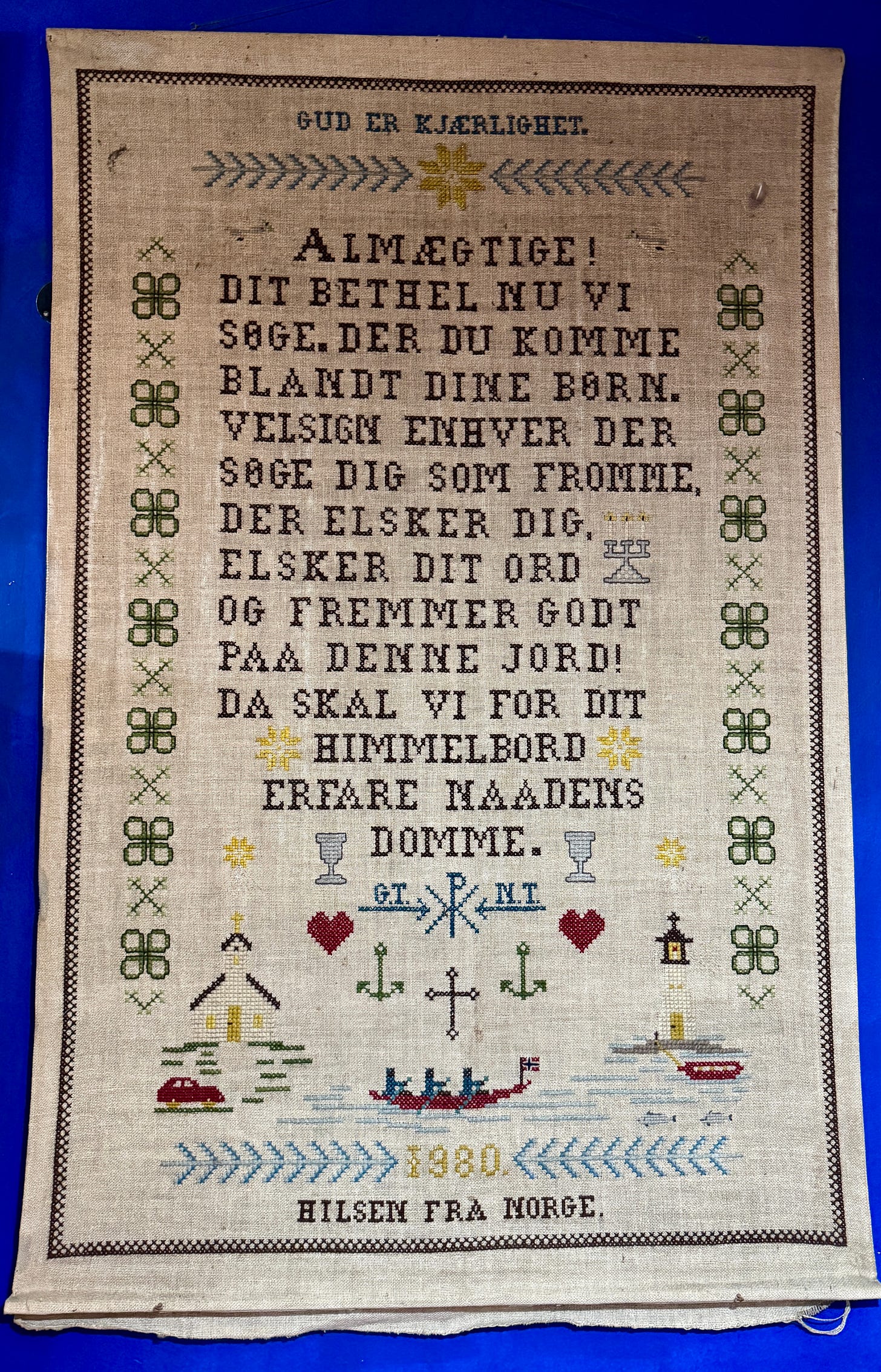 UD ER KJÆRLIGHET. ALMÆGTIGE! DIT BETHEL NU VI SØGE, DER DU KOMME BLANDT DINE BØRN. VELSIGN ENHVER DER SØGE DIG SOM FROMME, DER ELSKER DIT ORD OG FREMMER GODT PAA DENNE JORD! DA SKAL VI FOR DIT HIMMELBORD ERFARE NÅDENS DOMTNE. G.T. P.T. 1980 HILSEN FRA NORGE. ---------- God is love. Almighty! Your Bethel now we seek, where you come among your children. Bless everyone who seeks you as pious, who loves your word and promotes good on this earth! Then we shall at your heavenly table experience the judgment of grace. G.T. P.T. 1980 Greetings from Norway.