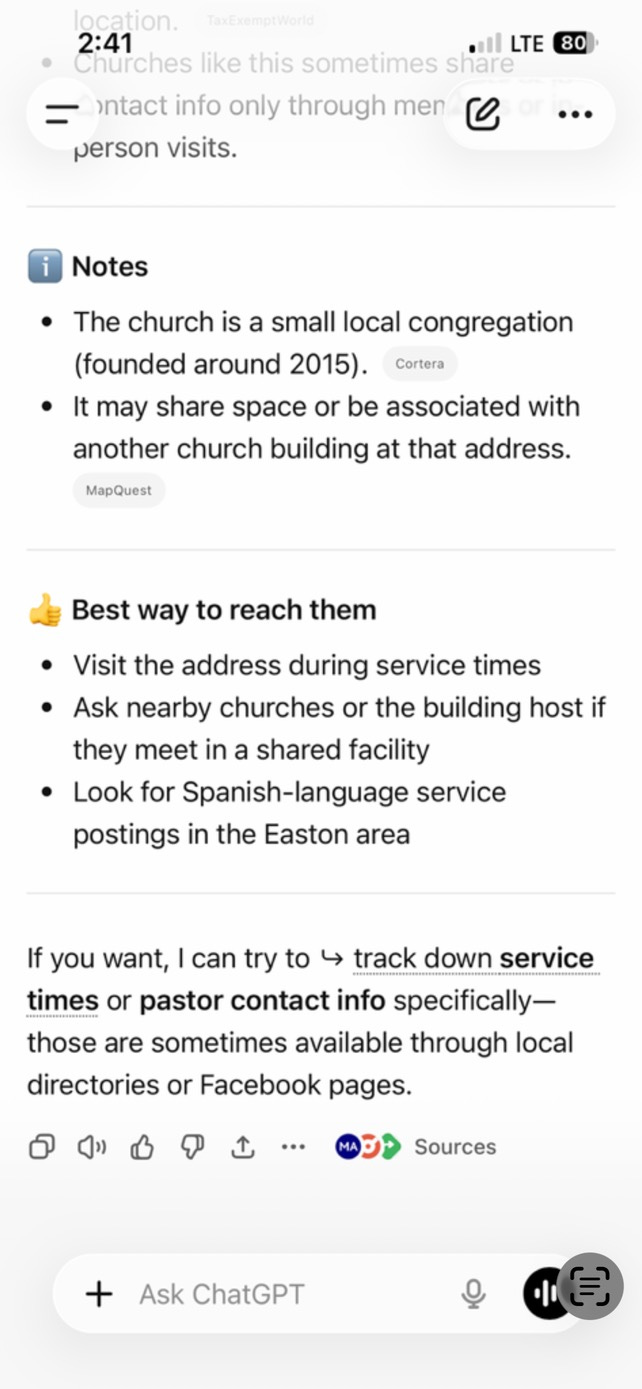 However, that officer of the guest congregation does not have a publicly listed telephone number or email address, and the host congregation’s members cannot reach him directly. In fact, even if one searches for information about contacting the guest congregation, the results direct one to either visit the host LCMS congregation’s street address or ask members of the host congregation. Likewise, Moody’s online business listing directory lists the guest congregation’s contact information under the host LCMS congregation’s address.