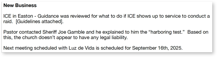 In the summer of 2025, the host congregation’s Board of Trustees (BOT) discussed U.S. Immigration and Customs Enforcement (ICE) activity in the area.1 The BOT minutes of August 19, 2025, record that “Guidance was reviewed for what to do if ICE shows up to service to conduct a raid,” and that the pastor “contacted Sheriff Joe Gamble and he explained to him the ‘harboring test.’ Based on this, the church doesn’t appear to have any legal liability.” The minutes also note a “Dinner with Luz de Vida Leadership” scheduled for the following evening, reflecting the close social relationship between the host and guest congregations’ leadership.