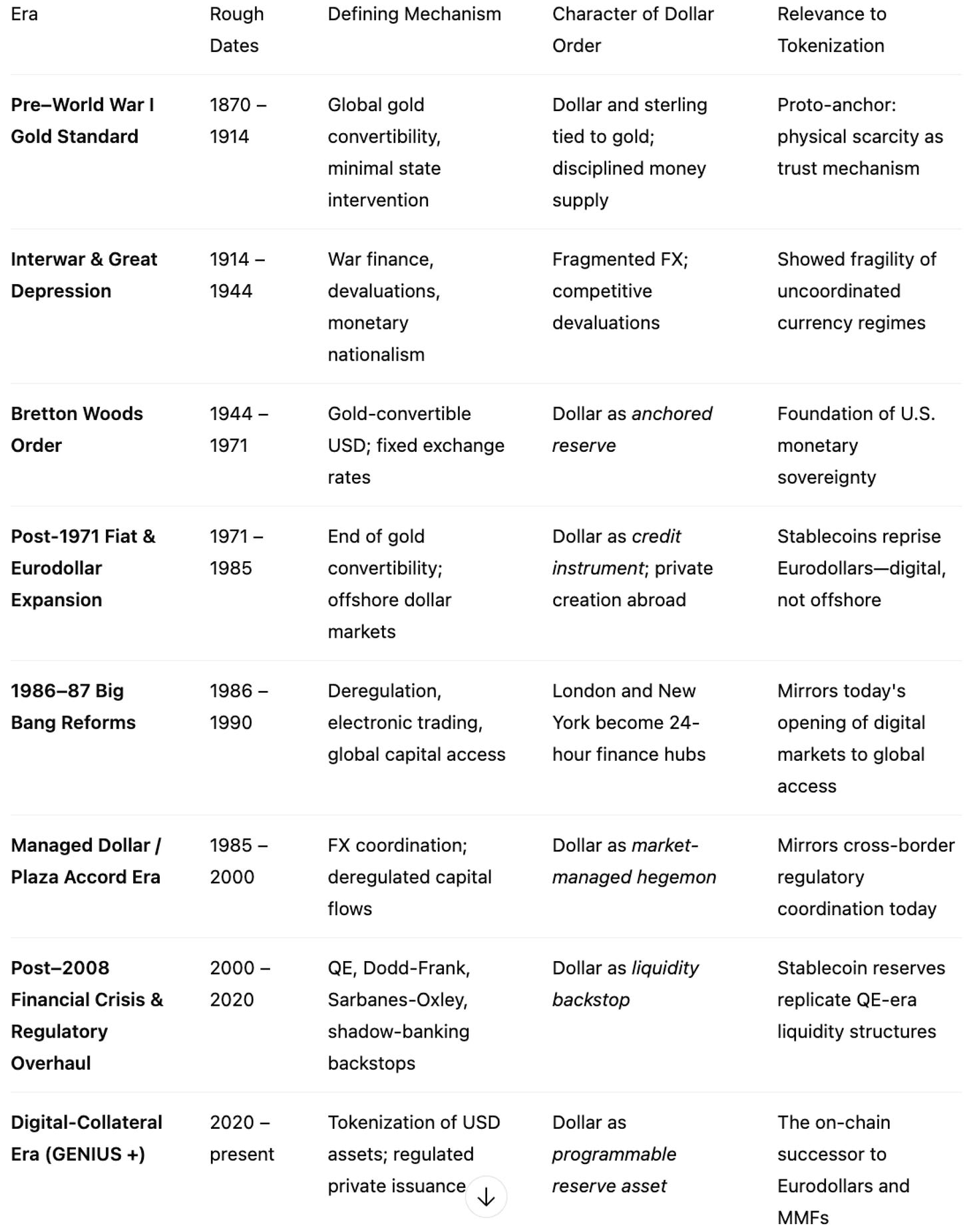 To see where we are in the never-ending arc of monetary innovation, Table F maps eight recent major eras—from the gold standard to today’s digital-collateral regime—showing how each shift redefined what backed the dollar and who governed it.