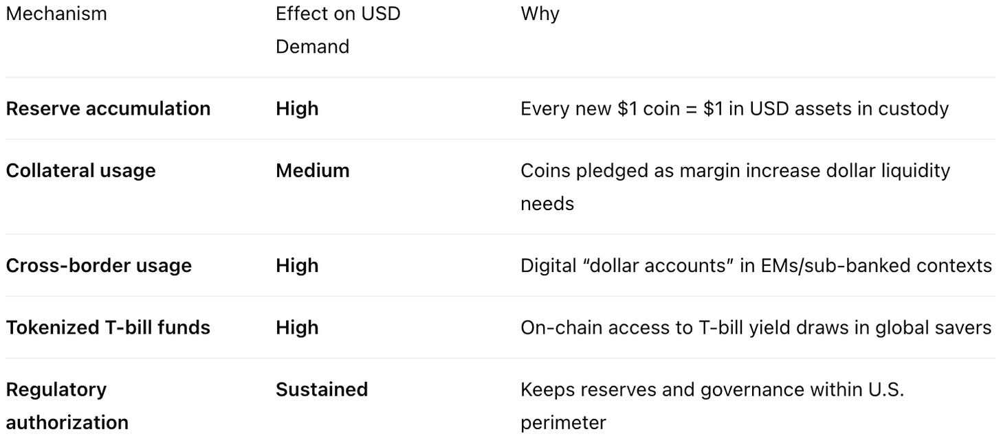 The dollar system gains a new demand base and distribution channel: every coin backed by T-bills/bank cash increases embedded demand for U.S. assets.