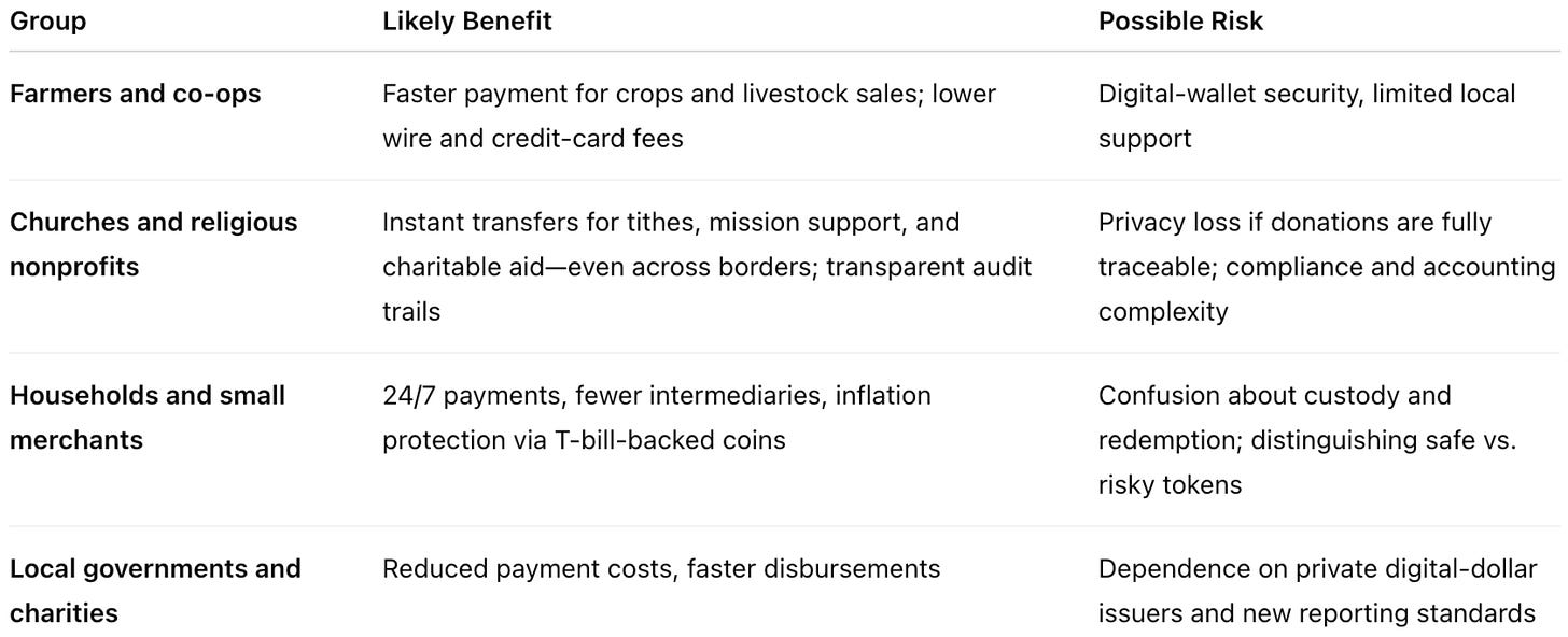 Church treasurers won’t need to wait for bank transfers to clear or pay extra for cross-border mission giving. Stablecoins can move funds internationally in seconds, reaching the missionary’s wallet directly —not days later, after fees.
