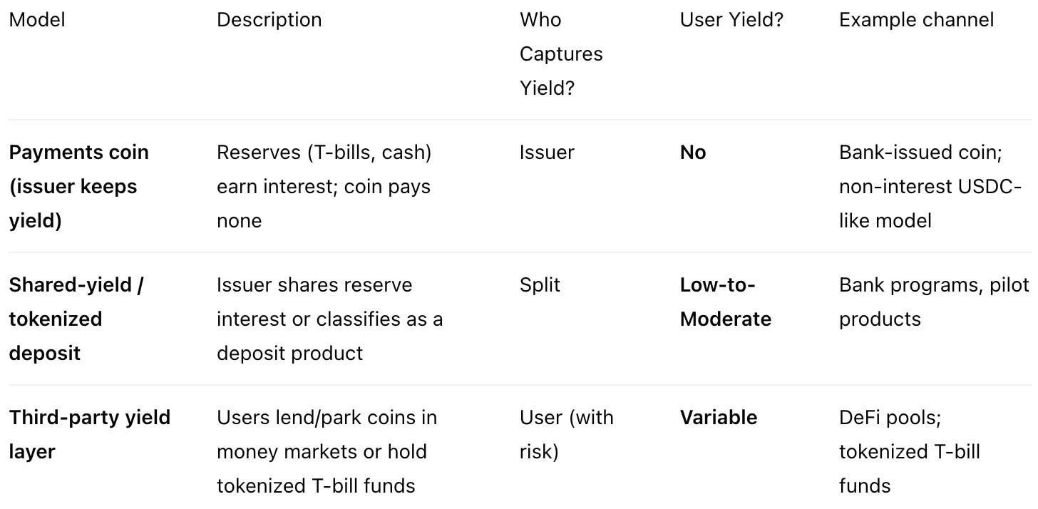 Payment coins usually pay 0% to remain compliant and straightforward. Users seeking yield migrate to tokenized T-bill products or lending markets, accepting added risk.