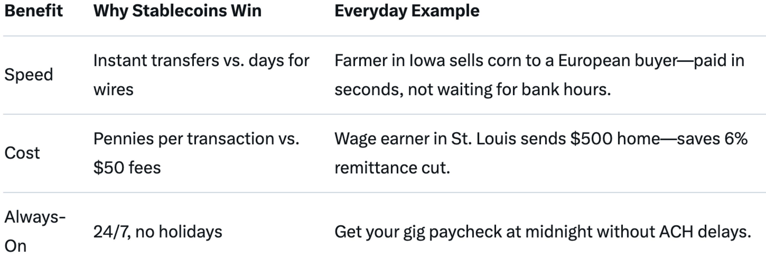 Table A — Functional Benefits: What stablecoins do that bank dollars do not