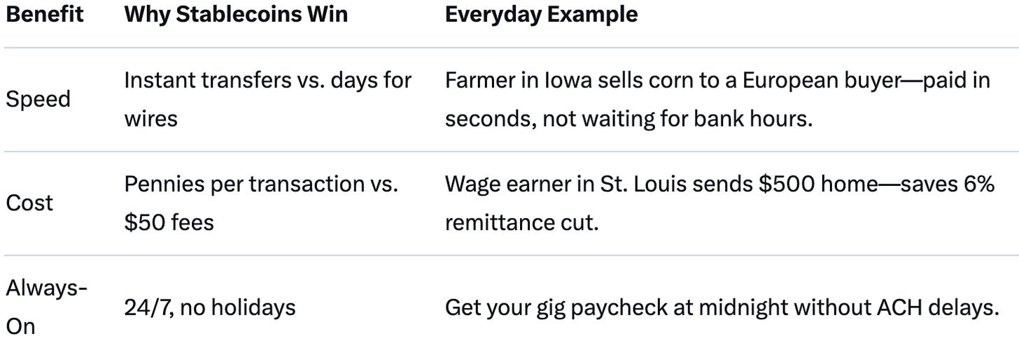 Imagine you’re selling corn to a grain buyer in another state. Instead of waiting two business days for a wire or losing 3% to card processors, you could be paid instantly in a digital dollar backed by U.S. Treasuries, cash that settles before you leave the grain silo.
